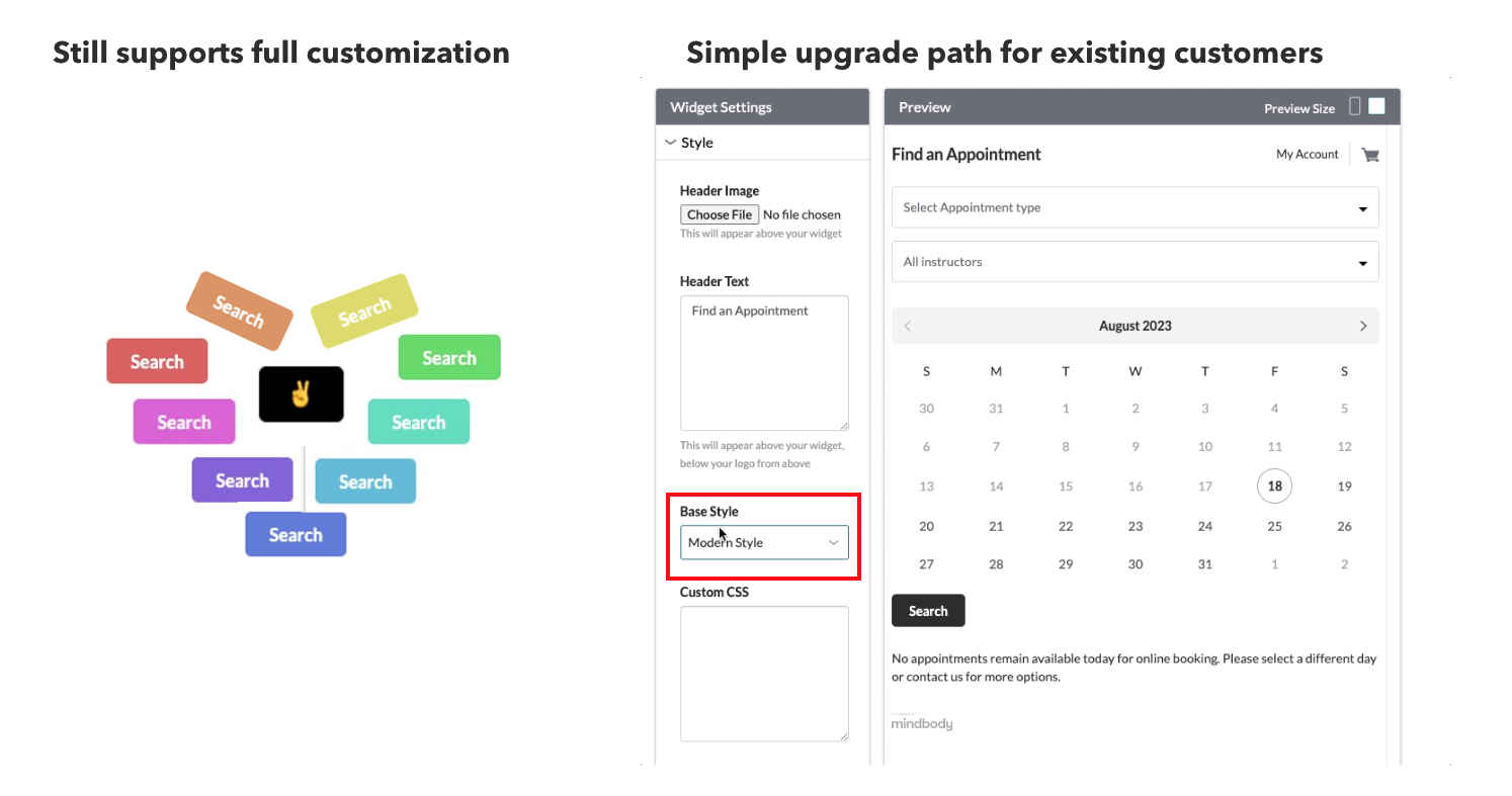The mindbody components support many customization options and provide a path for existing customers to upgrade to the new theme using a simple drop down menu.